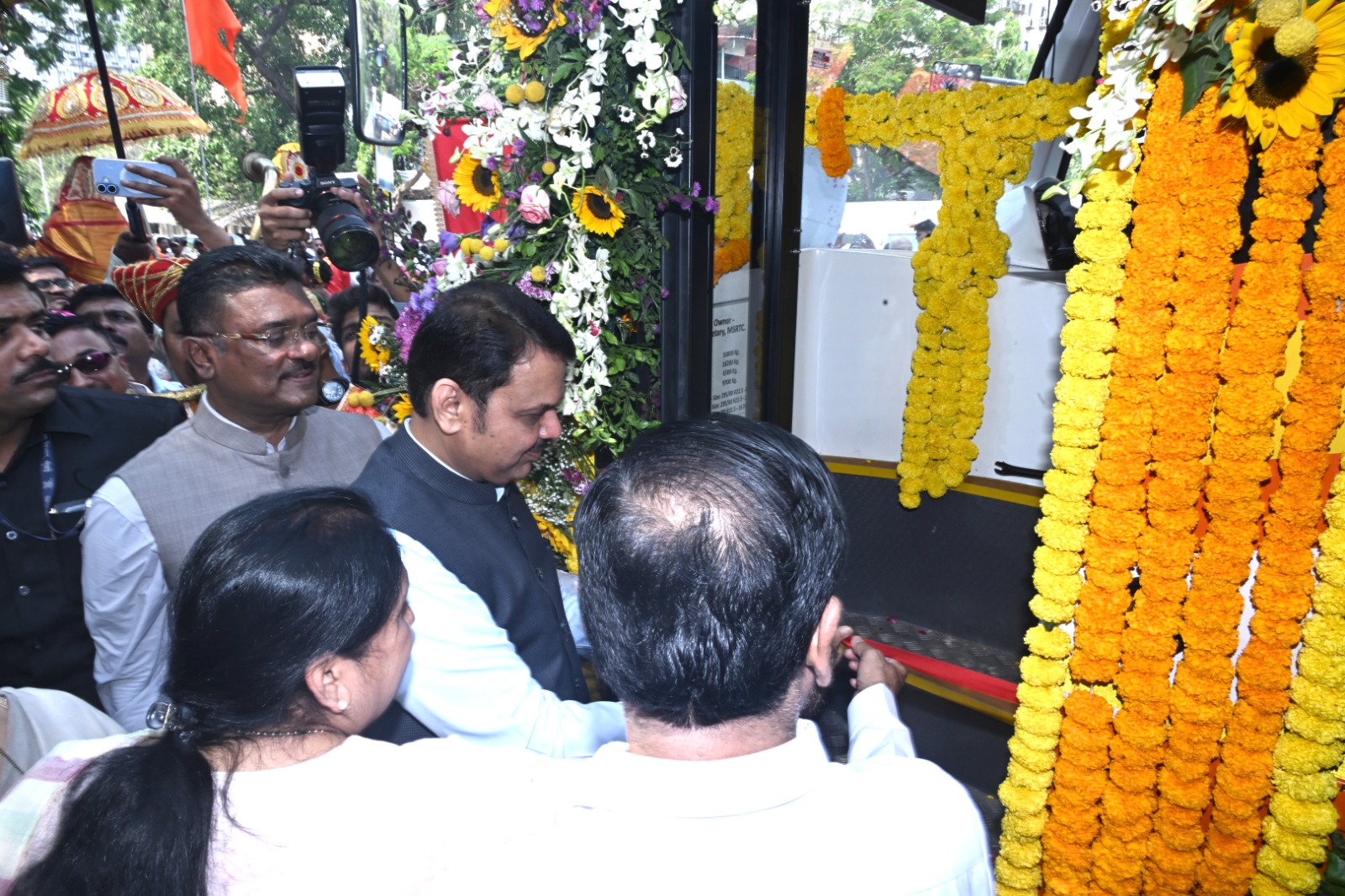 मुख्यमंत्री फडणवीस तसेच उपमुख्यमंत्री शिंदे, उपमुख्यमंत्री श्रीमती पवार यांनी बसचे पूजन करून आणि फीत कापून या सेवेचा शुभारंभ केला. या बस सेवेचे लोकार्पण झाल्यानंतर उपस्थित मान्यवरांनी बसमधून प्रवास करत बससेवेची सुरूवात केली. यावेळी बसच्या समोर प्रतिकात्मक स्वरूपात घोड्यावर आरूढ झालेल्या राजमाता जिजाऊ यांच्या देखाव्यामुळे हा लोकार्पण सोहळा ऐतिहासिक आणि प्रेरणादायी ठरला.